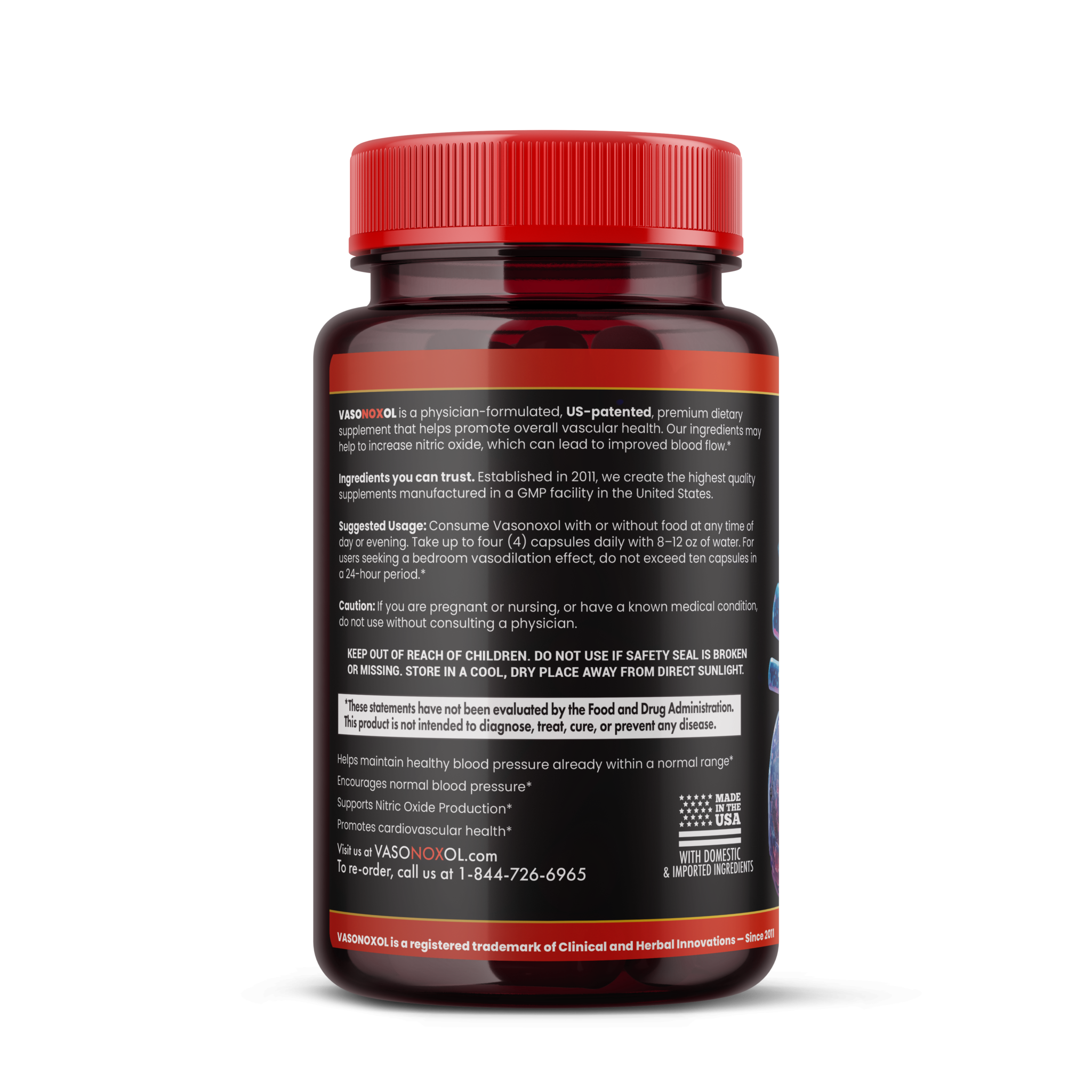 We continually seek the highest-quality domestic and internationally sourced ingredients for our products. Vasonoxol is 100% U.S.-manufactured for Clinical and